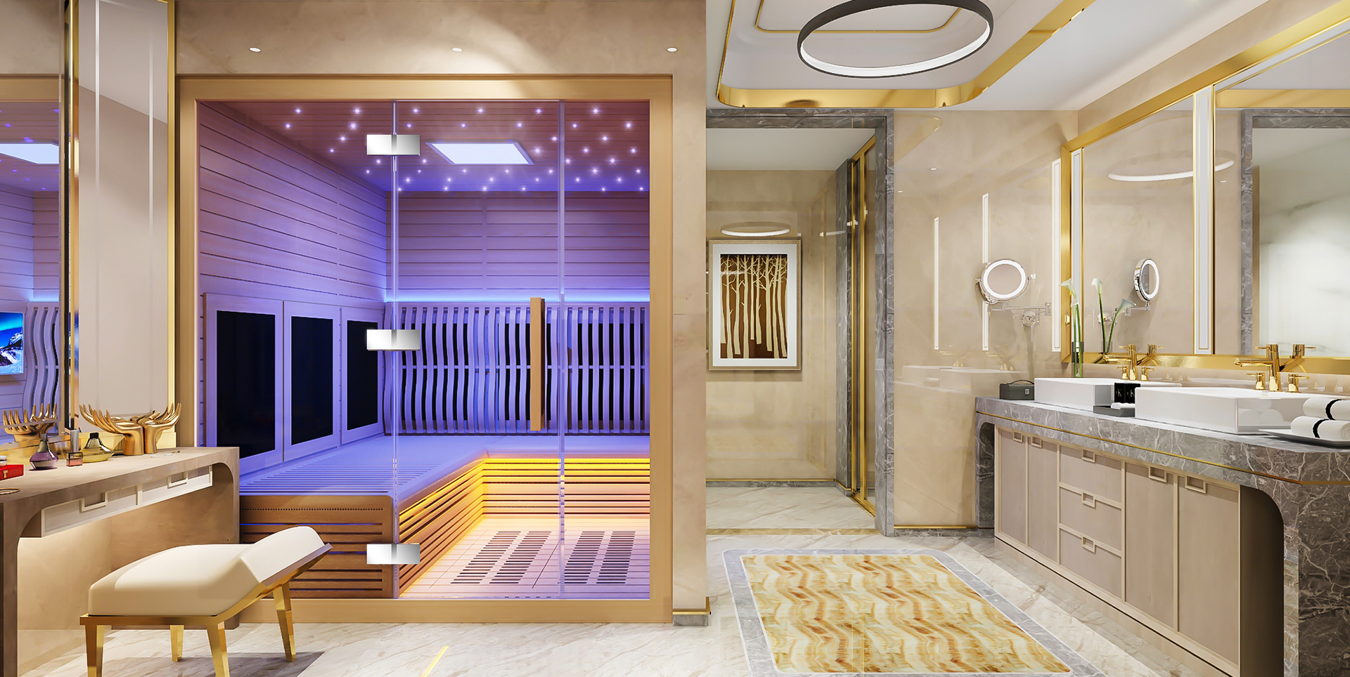 穿越星空,放空身心 欧籁星空系列,是一款特色显著的产品。设计师把星空的元素融进光波房里,丰富的灯光变化,能模仿出星空给人恬静舒适的感觉,置身于其中,犹如在星辰中遨游。 |